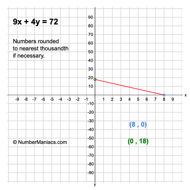 We will start by calculating and showing you the solution for the x-intercept and y-intercept of 9x + 4y = 72.