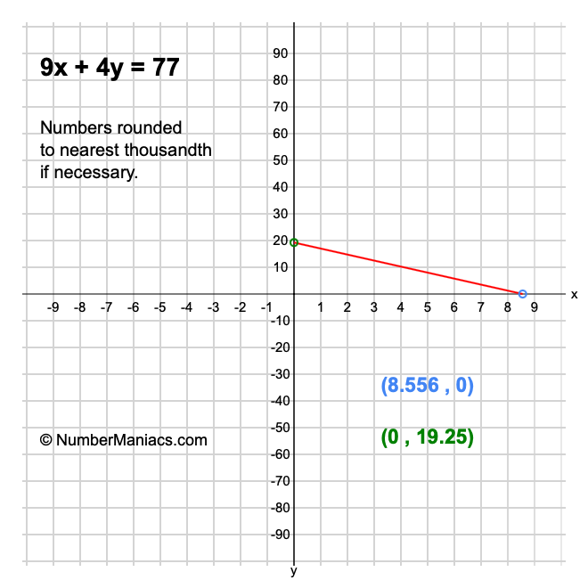 We will start by calculating and showing you the solution for the x-intercept and y-intercept of 9x + 4y = 77.