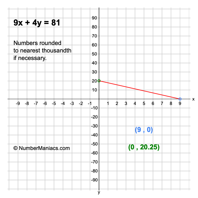 We will start by calculating and showing you the solution for the x-intercept and y-intercept of 9x + 4y = 81.
