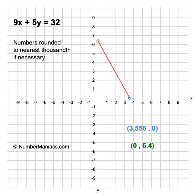 We will start by calculating and showing you the solution for the x-intercept and y-intercept of 9x + 5y = 32.