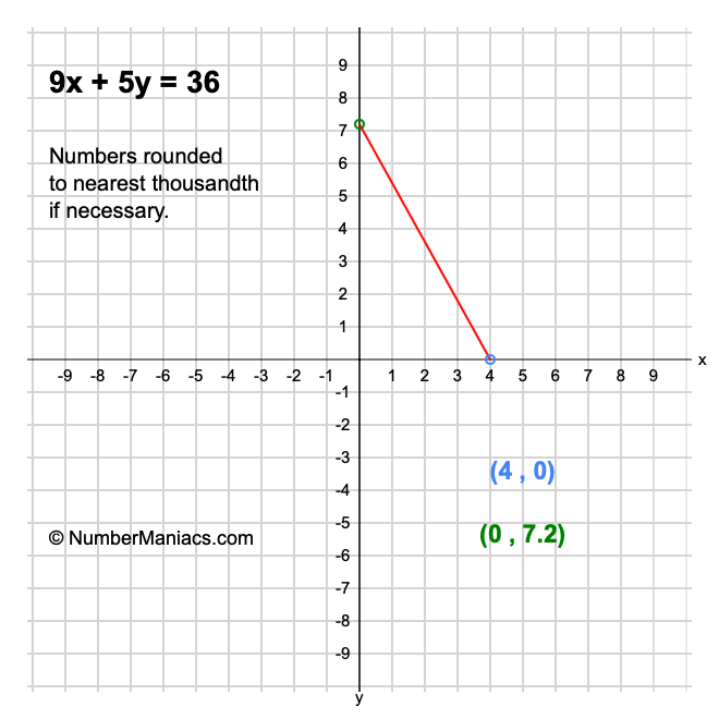We will start by calculating and showing you the solution for the x-intercept and y-intercept of 9x + 5y = 36.