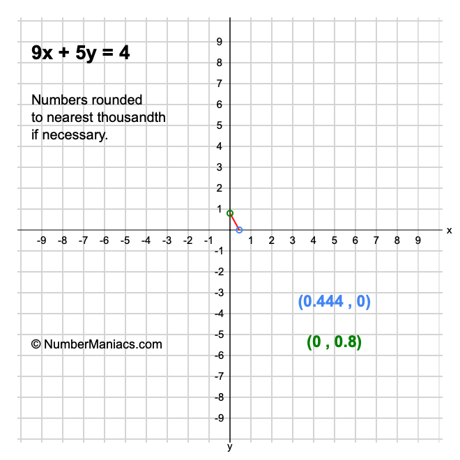 We will start by calculating and showing you the solution for the x-intercept and y-intercept of 9x + 5y = 4.