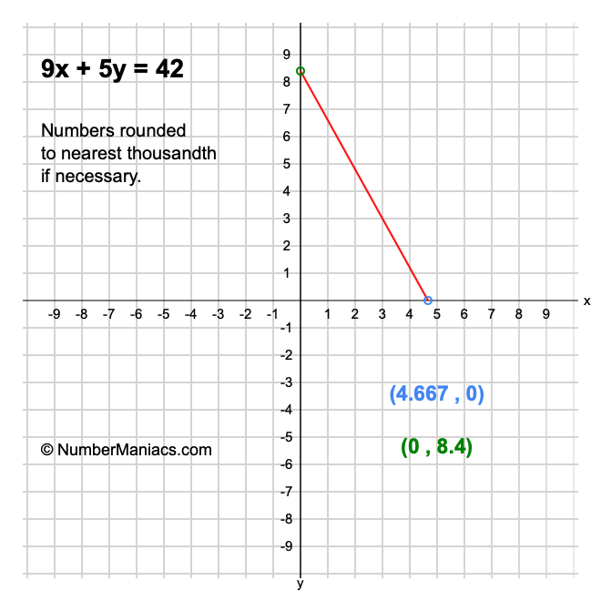 We will start by calculating and showing you the solution for the x-intercept and y-intercept of 9x + 5y = 42.