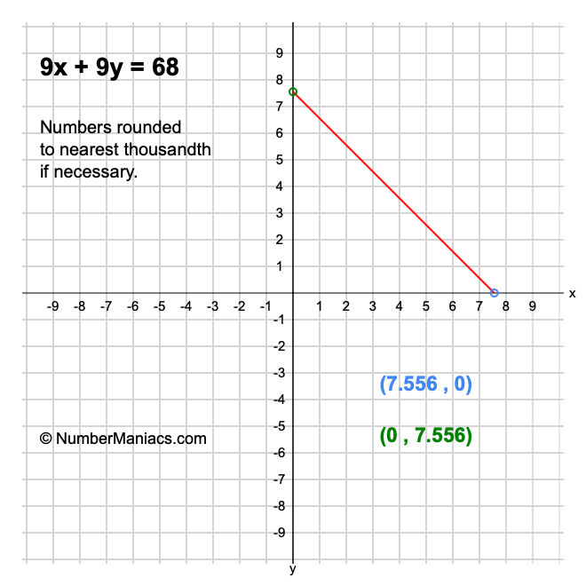 We will start by calculating and showing you the solution for the x-intercept and y-intercept of 9x + 9y = 68.