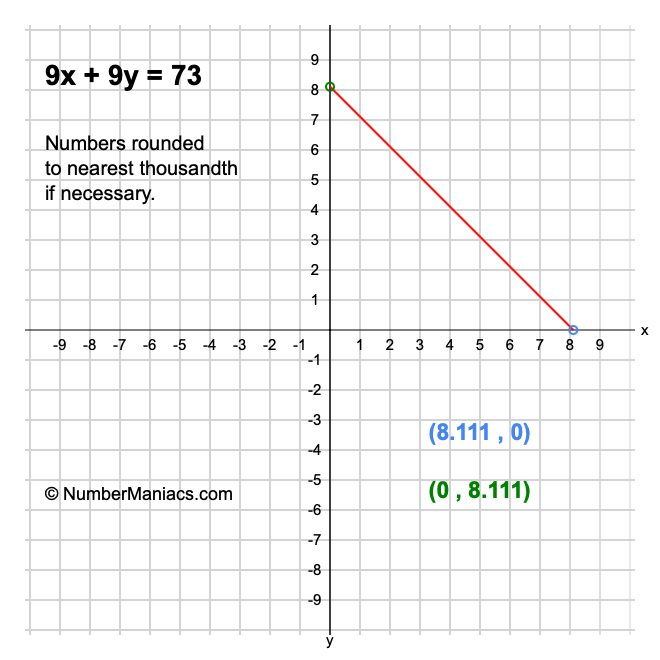 We will start by calculating and showing you the solution for the x-intercept and y-intercept of 9x + 9y = 73.