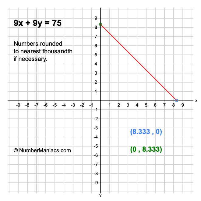 We will start by calculating and showing you the solution for the x-intercept and y-intercept of 9x + 9y = 75.