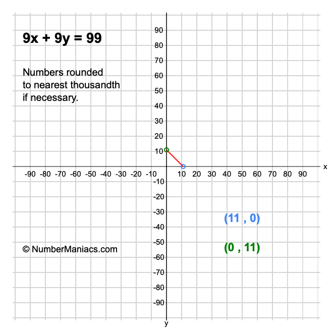 Then, we will show you how to get the graph plot coordinates for 9x + 9y = 99 so we can illustrate it on a graph.