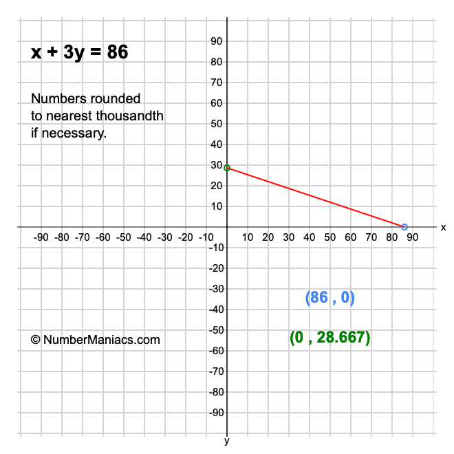Then, we will show you how to get the graph plot coordinates for x + 3y = 86 so we can illustrate it on a graph.