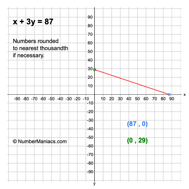 Thus, we use the x-intercept and y-intercept results above to get the graph plots for x + 3y = 87 as follows: