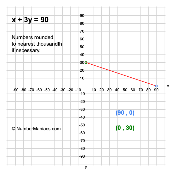 Finally, we will solve x + 3y = 90 for x and also for y, then calculate and show you the solution for the slope of x + 3y = 90.