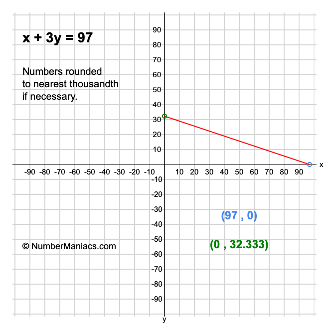 Finally, we will solve x + 3y = 97 for x and also for y, then calculate and show you the solution for the slope of x + 3y = 97.