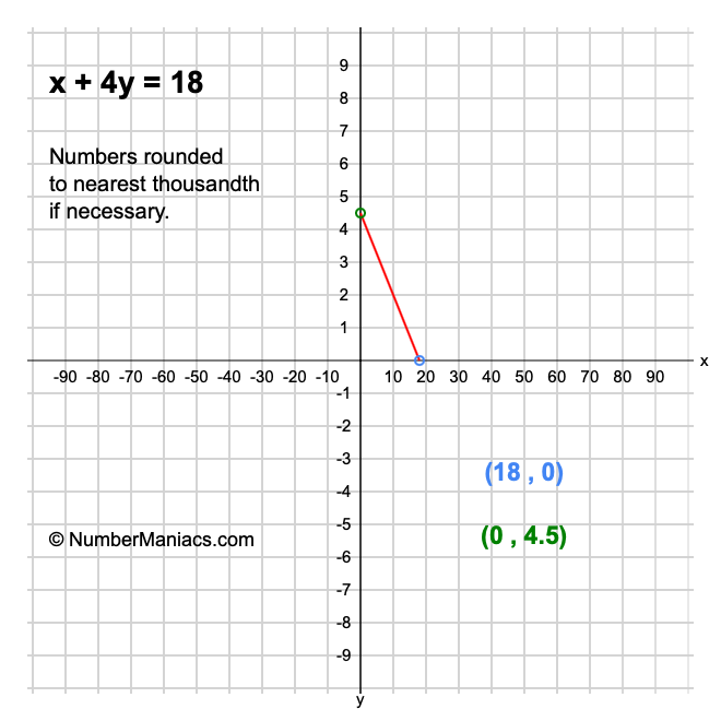 We will start by calculating and showing you the solution for the x-intercept and y-intercept of x + 4y = 18.