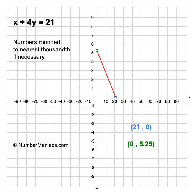 We will start by calculating and showing you the solution for the x-intercept and y-intercept of x + 4y = 21.