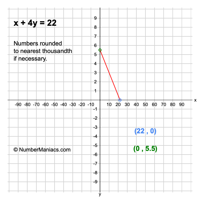 We will start by calculating and showing you the solution for the x-intercept and y-intercept of x + 4y = 22.