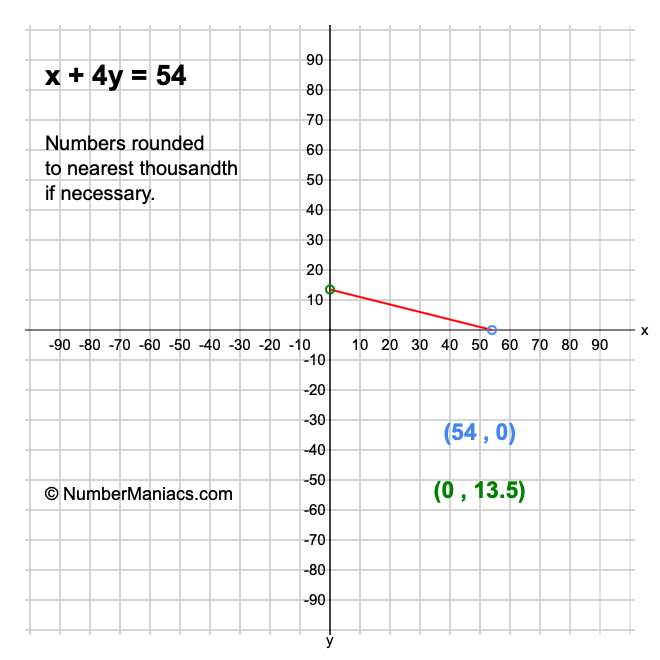 We will start by calculating and showing you the solution for the x-intercept and y-intercept of x + 4y = 54.