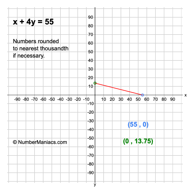 Then, we will show you how to get the graph plot coordinates for x + 4y = 55 so we can illustrate it on a graph.