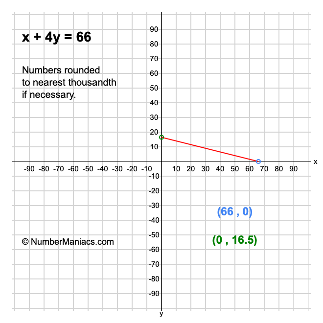 Then, we will show you how to get the graph plot coordinates for x + 4y = 66 so we can illustrate it on a graph.