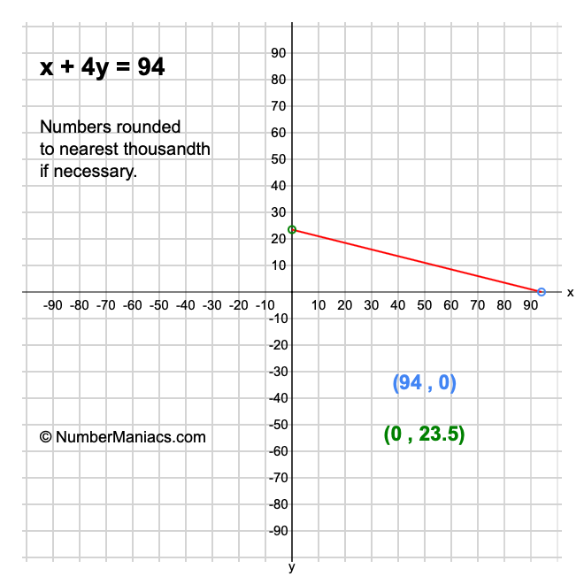 We will start by calculating and showing you the solution for the x-intercept and y-intercept of x + 4y = 94.