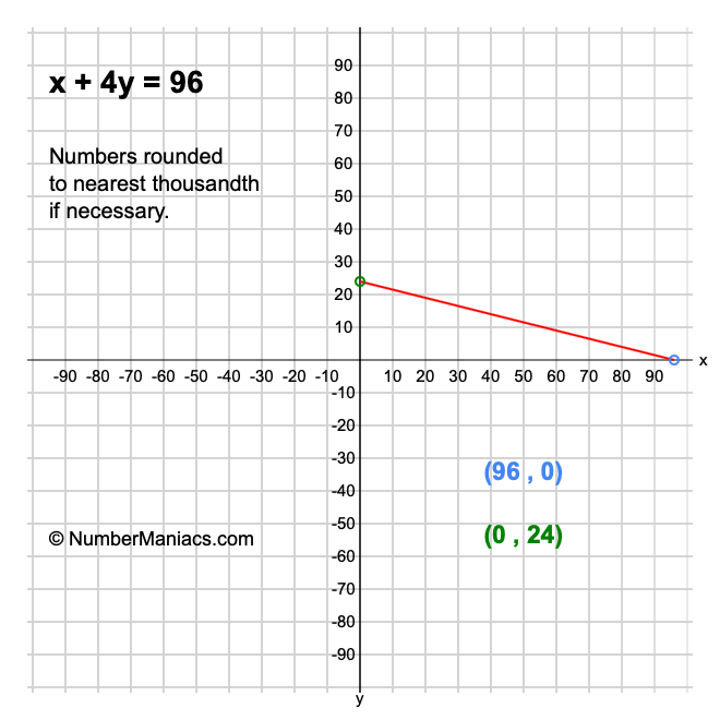 Then, we will show you how to get the graph plot coordinates for x + 4y = 96 so we can illustrate it on a graph.