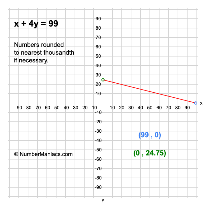 We will start by calculating and showing you the solution for the x-intercept and y-intercept of x + 4y = 99.