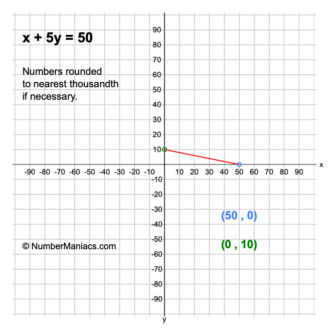 Then, we will show you how to get the graph plot coordinates for x + 5y = 50 so we can illustrate it on a graph.