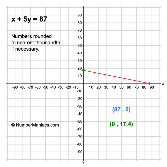 We will start by calculating and showing you the solution for the x-intercept and y-intercept of x + 5y = 87.