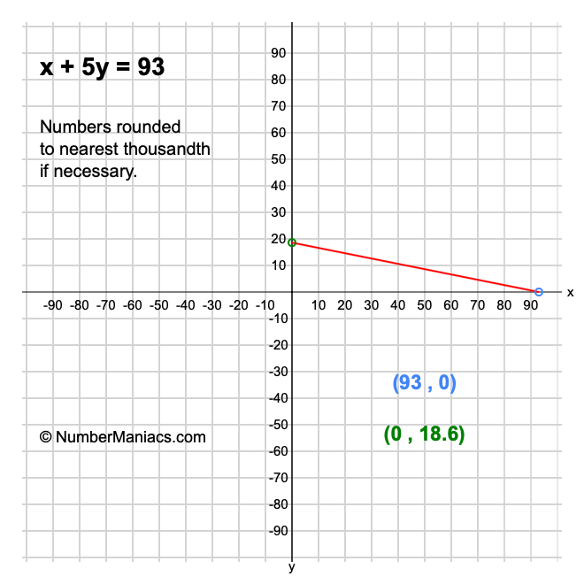 We will start by calculating and showing you the solution for the x-intercept and y-intercept of x + 5y = 93.