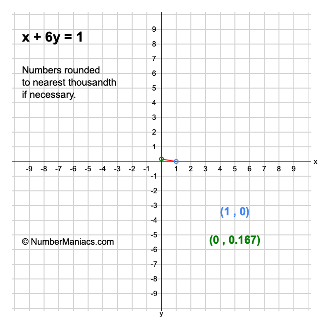 We will start by calculating and showing you the solution for the x-intercept and y-intercept of x + 6y = 1.