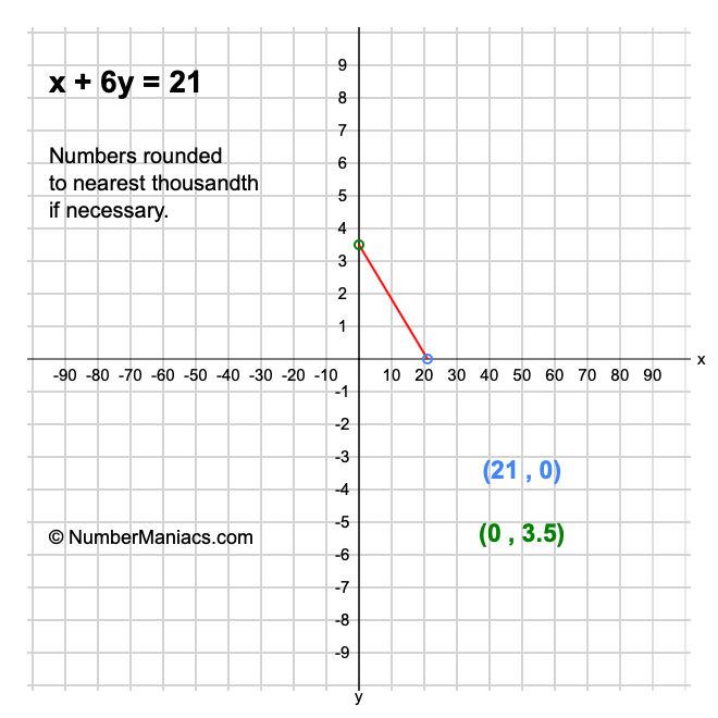 We will start by calculating and showing you the solution for the x-intercept and y-intercept of x + 6y = 21.