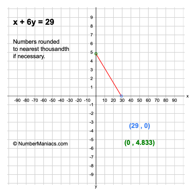 We will start by calculating and showing you the solution for the x-intercept and y-intercept of x + 6y = 29.