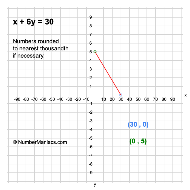 Finally, we will solve x + 6y = 30 for x and also for y, then calculate and show you the solution for the slope of x + 6y = 30.