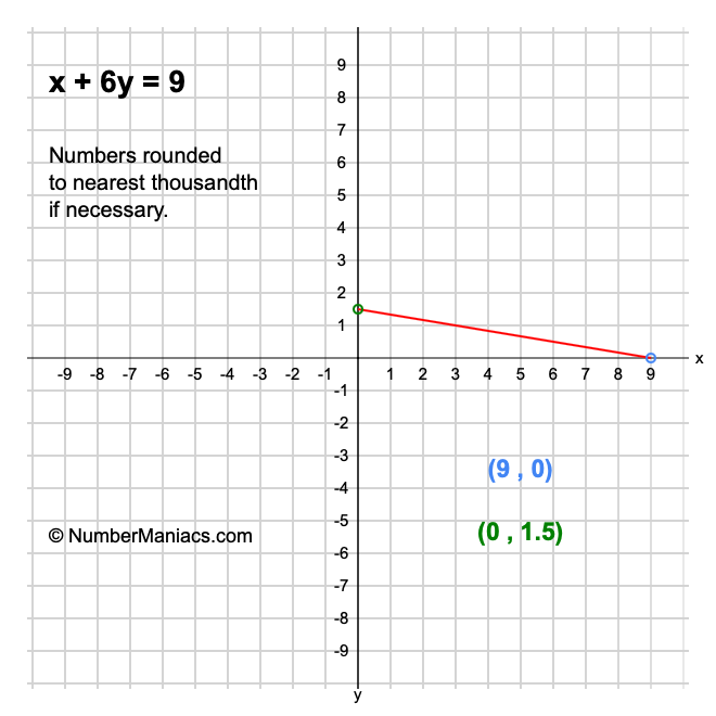 We will start by calculating and showing you the solution for the x-intercept and y-intercept of x + 6y = 9.