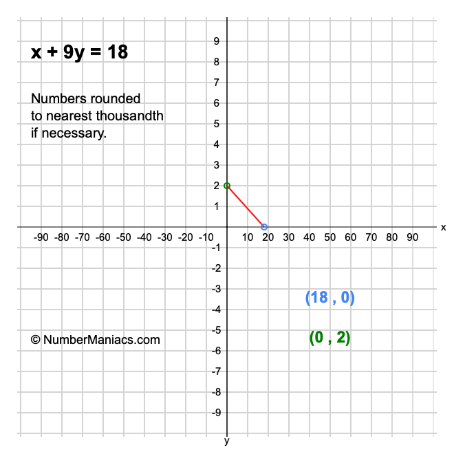 We will start by calculating and showing you the solution for the x-intercept and y-intercept of x + 9y = 18.