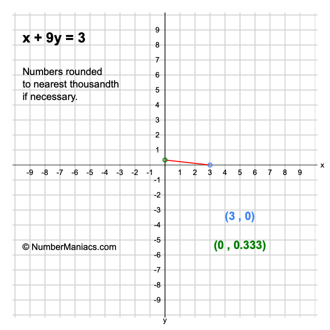 We will start by calculating and showing you the solution for the x-intercept and y-intercept of x + 9y = 3.