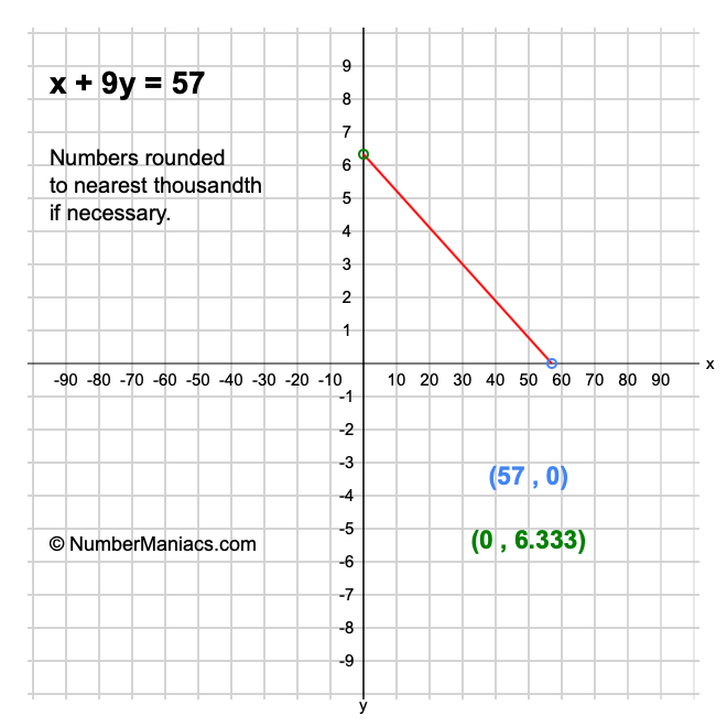 We will start by calculating and showing you the solution for the x-intercept and y-intercept of x + 9y = 57.