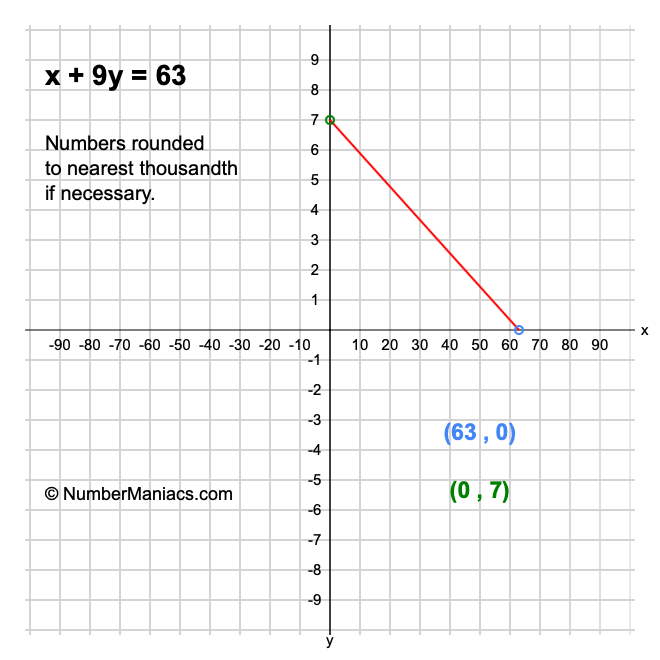 We will start by calculating and showing you the solution for the x-intercept and y-intercept of x + 9y = 63.