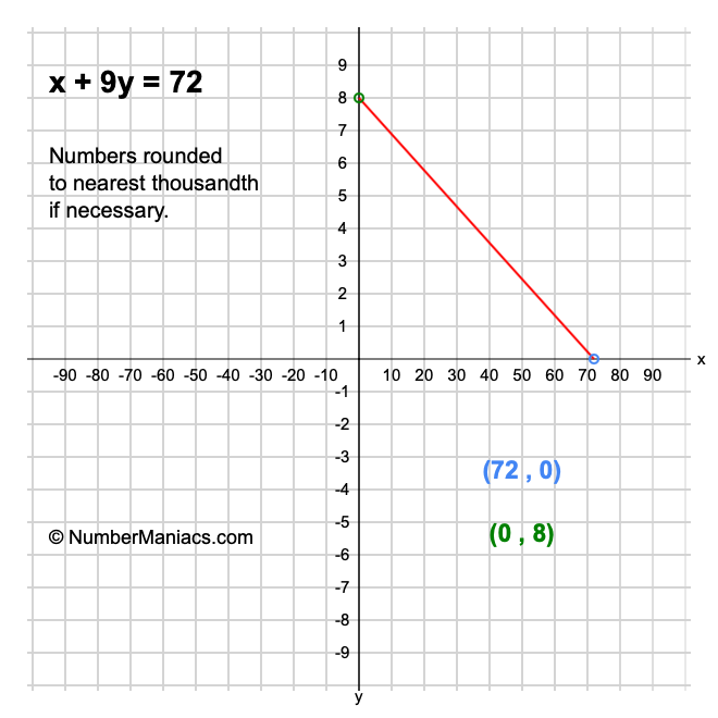 Then, we will show you how to get the graph plot coordinates for x + 9y = 72 so we can illustrate it on a graph.