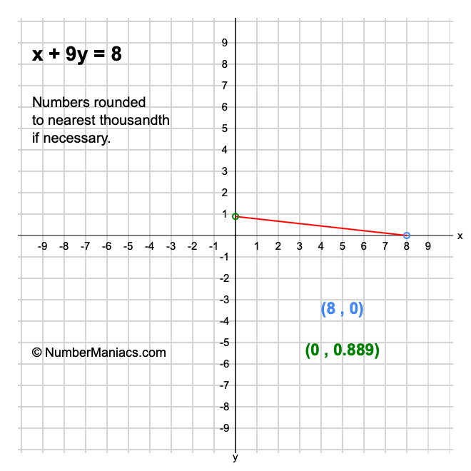 We will start by calculating and showing you the solution for the x-intercept and y-intercept of x + 9y = 8.