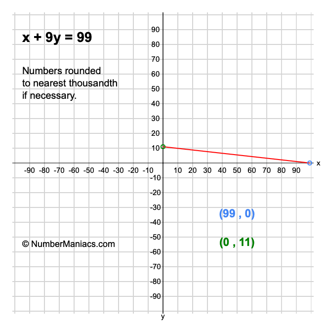 Finally, we will solve x + 9y = 99 for x and also for y, then calculate and show you the solution for the slope of x + 9y = 99.