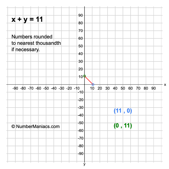 We will start by calculating and showing you the solution for the x-intercept and y-intercept of x + y = 11.