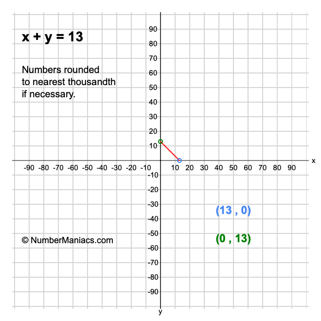 We will start by calculating and showing you the solution for the x-intercept and y-intercept of x + y = 13.