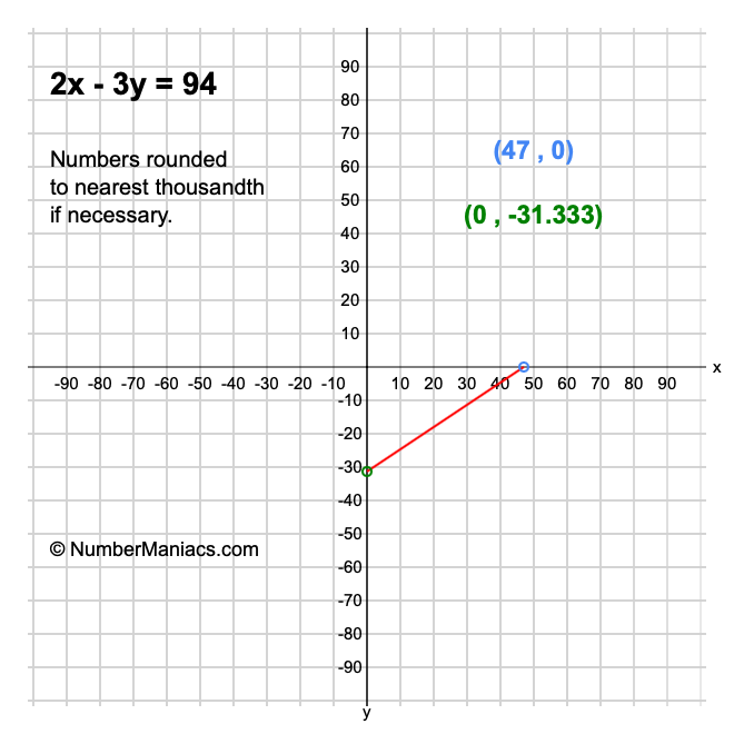 We will start by calculating and showing you the solution for the x-intercept and y-intercept of 2x - 3y = 94.