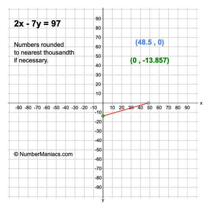 We will start by calculating and showing you the solution for the x-intercept and y-intercept of 2x - 7y = 97.