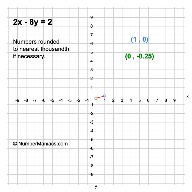 Finally, we will solve 2x - 8y = 2 for x and also for y, then calculate and show you the solution for the slope of 2x - 8y = 2.