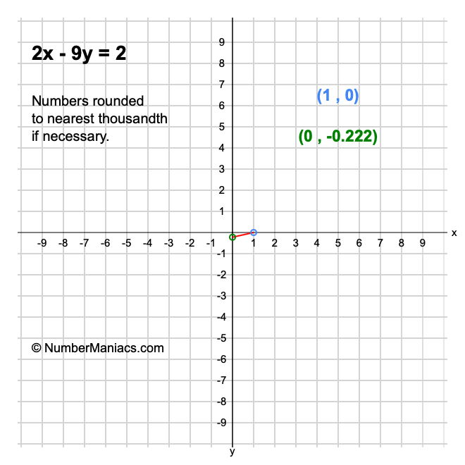 Thus, we use the x-intercept and y-intercept results above to get the graph plots for 2x - 9y = 2 as follows: