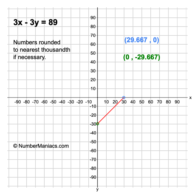 We will start by calculating and showing you the solution for the x-intercept and y-intercept of 3x - 3y = 89.