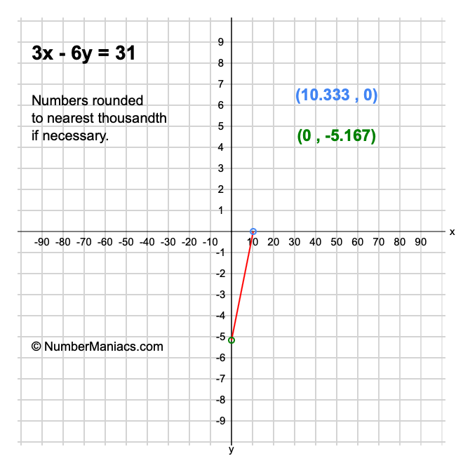 We will start by calculating and showing you the solution for the x-intercept and y-intercept of 3x - 6y = 31.