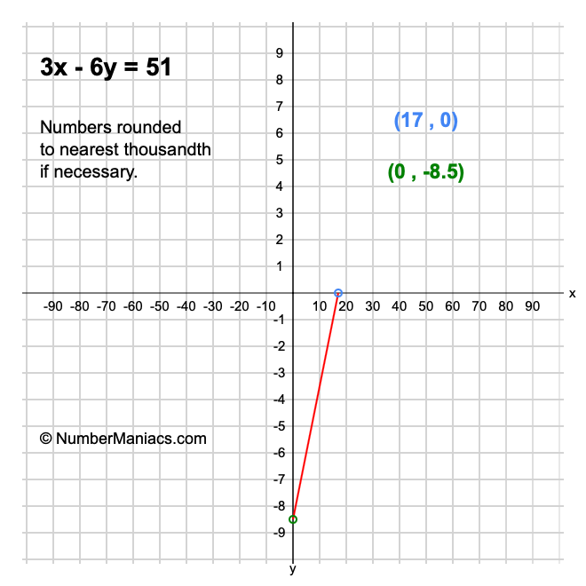 We will start by calculating and showing you the solution for the x-intercept and y-intercept of 3x - 6y = 51.