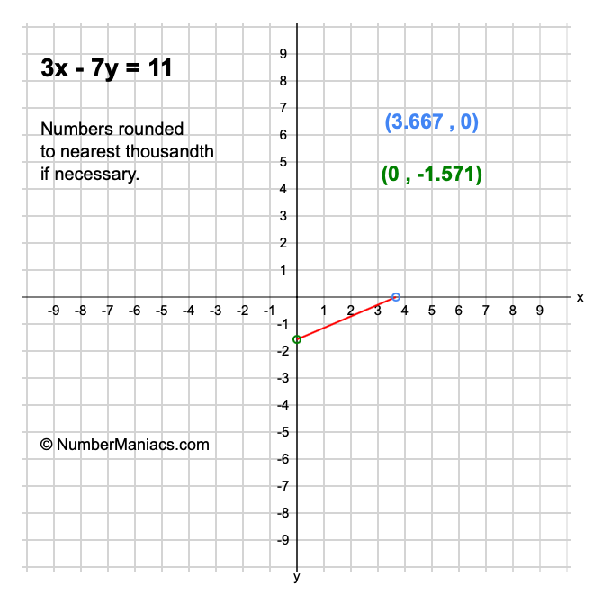 We will start by calculating and showing you the solution for the x-intercept and y-intercept of 3x - 7y = 11.