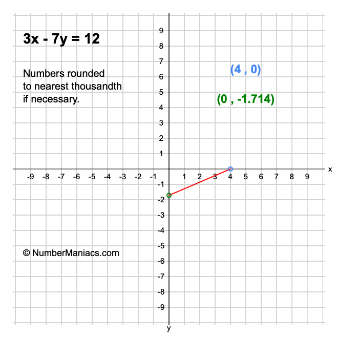 We will start by calculating and showing you the solution for the x-intercept and y-intercept of 3x - 7y = 12.